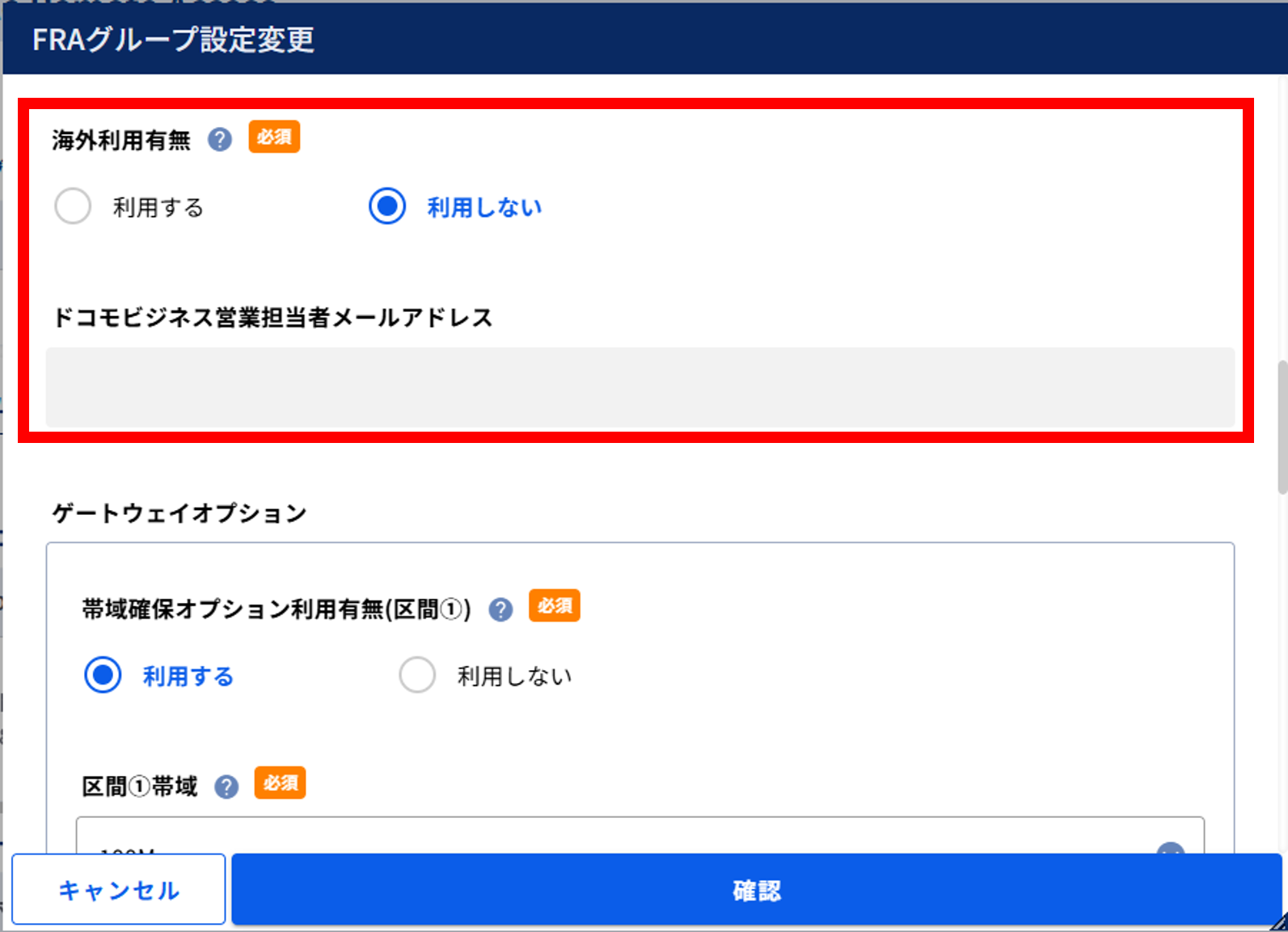 海外利用有無の箇所の選択を変更します。[利用する]に変更する場合はNTTドコモビジネス営業担当のメールアドレスも入力します。
