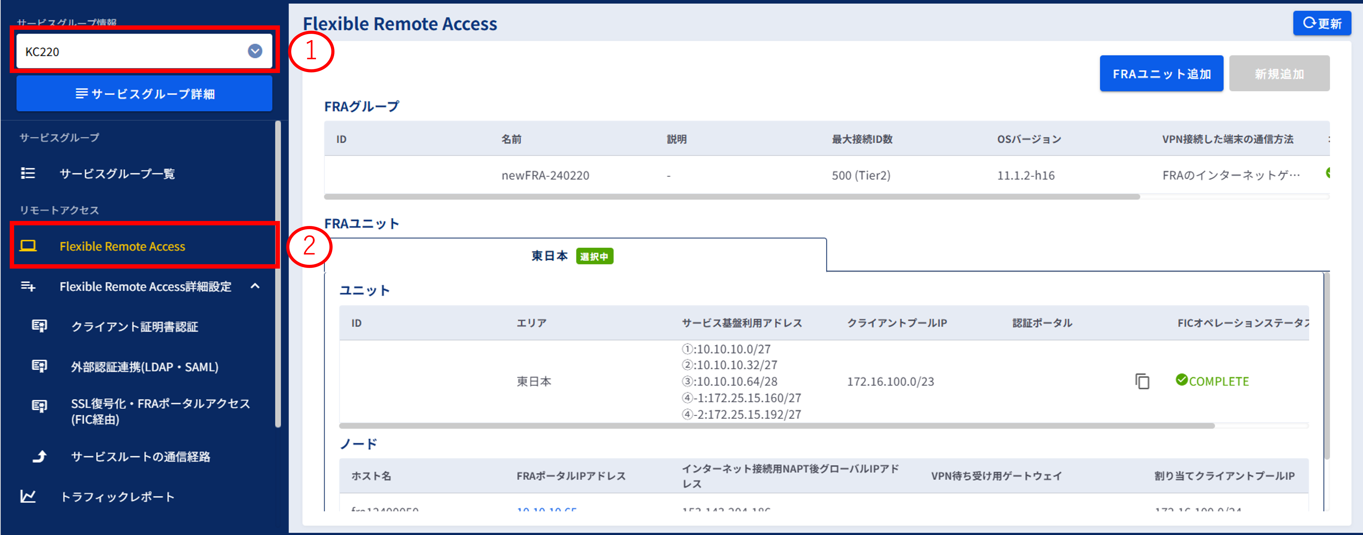 - ①左メニューの「サービスグループ情報」から作成したサービスグループを選択します。②[Flexible Remote Access]をクリックします。