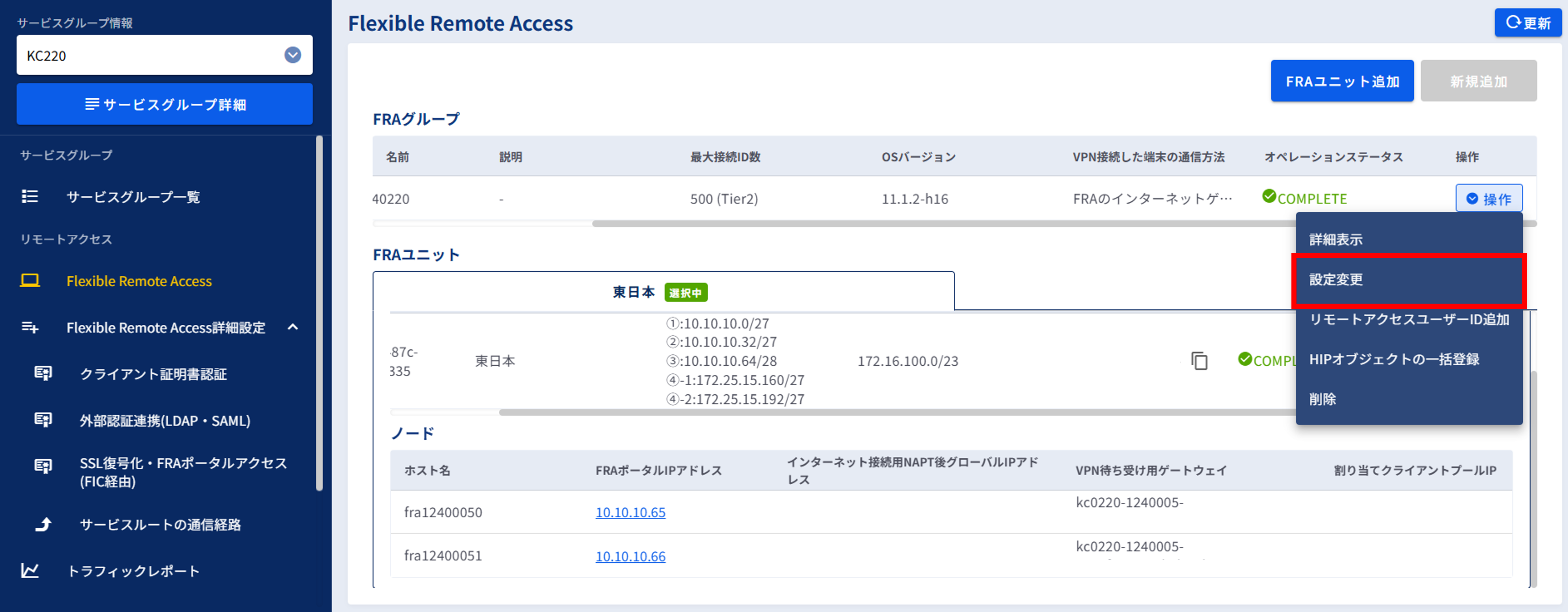 「FRAグループ」一覧で変更したいFRAグループの[操作]プルダウンメニューから[設定変更]を選択しクリックします。