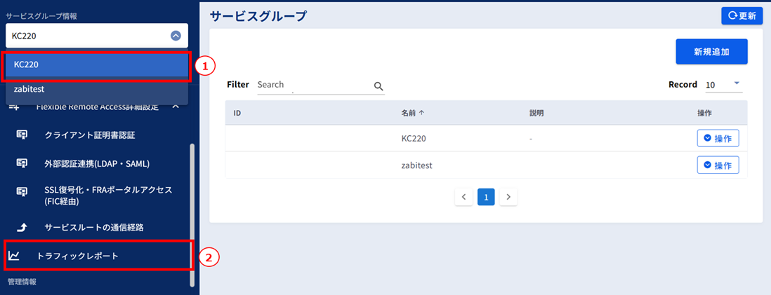 - ①左メニューの「サービスグループ情報」から対象のサービスグループを選択します。②[トラフィックレポート]をクリックします。