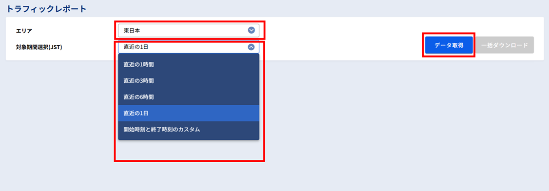 トラフィックレポート画面で必要な情報を入力します。入力が完了したら[データ取得]ボタンを押下します。