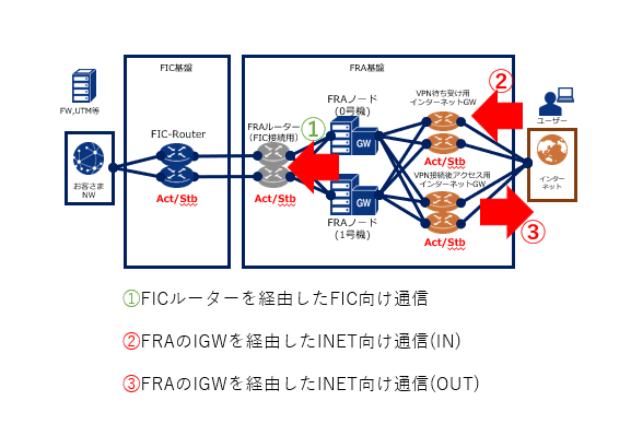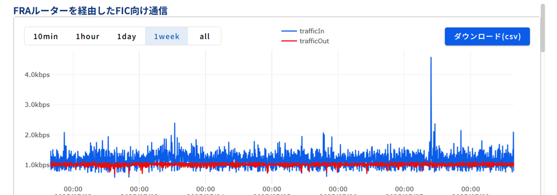 - FRA基盤内部では管理制御用に少量かつ一定のトラフィックが発生しているためトラフィックデータにはこれらのトラフィック量が含まれています。FRAとFICを接続していない場合でも「FICルーターを経由したFIC向け通信」のトラフィックデータには管理制御用のトラフィックが表示されます。