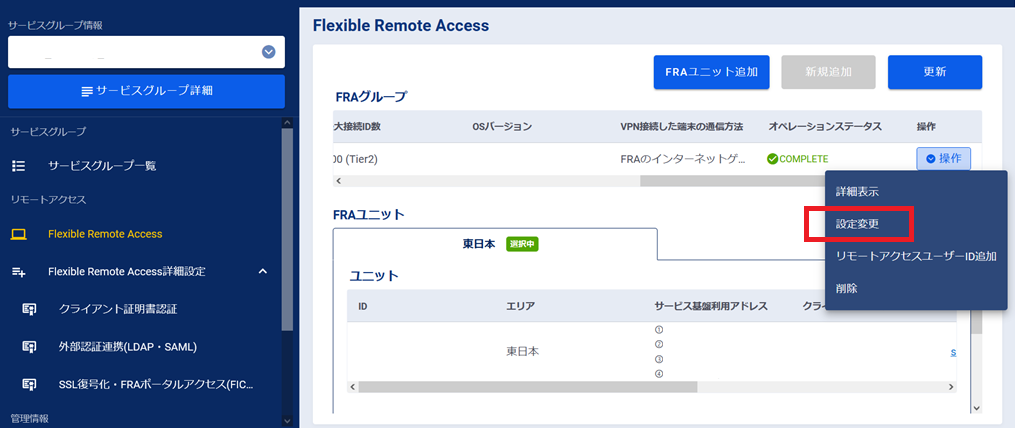 変更したいFRAユニットの[操作]プルダウンメニューから[設定変更]を押下します。