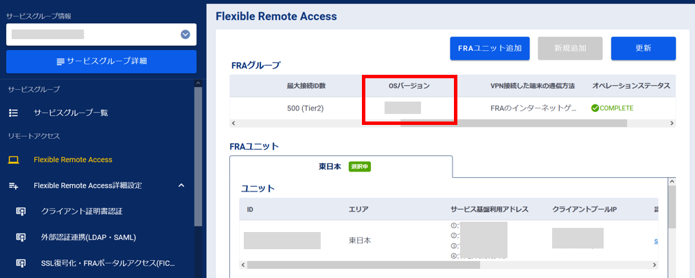 [Flexible Remote Access]の画面でOSバージョンが変更後のバージョンにバージョンアップされたことを確認します。