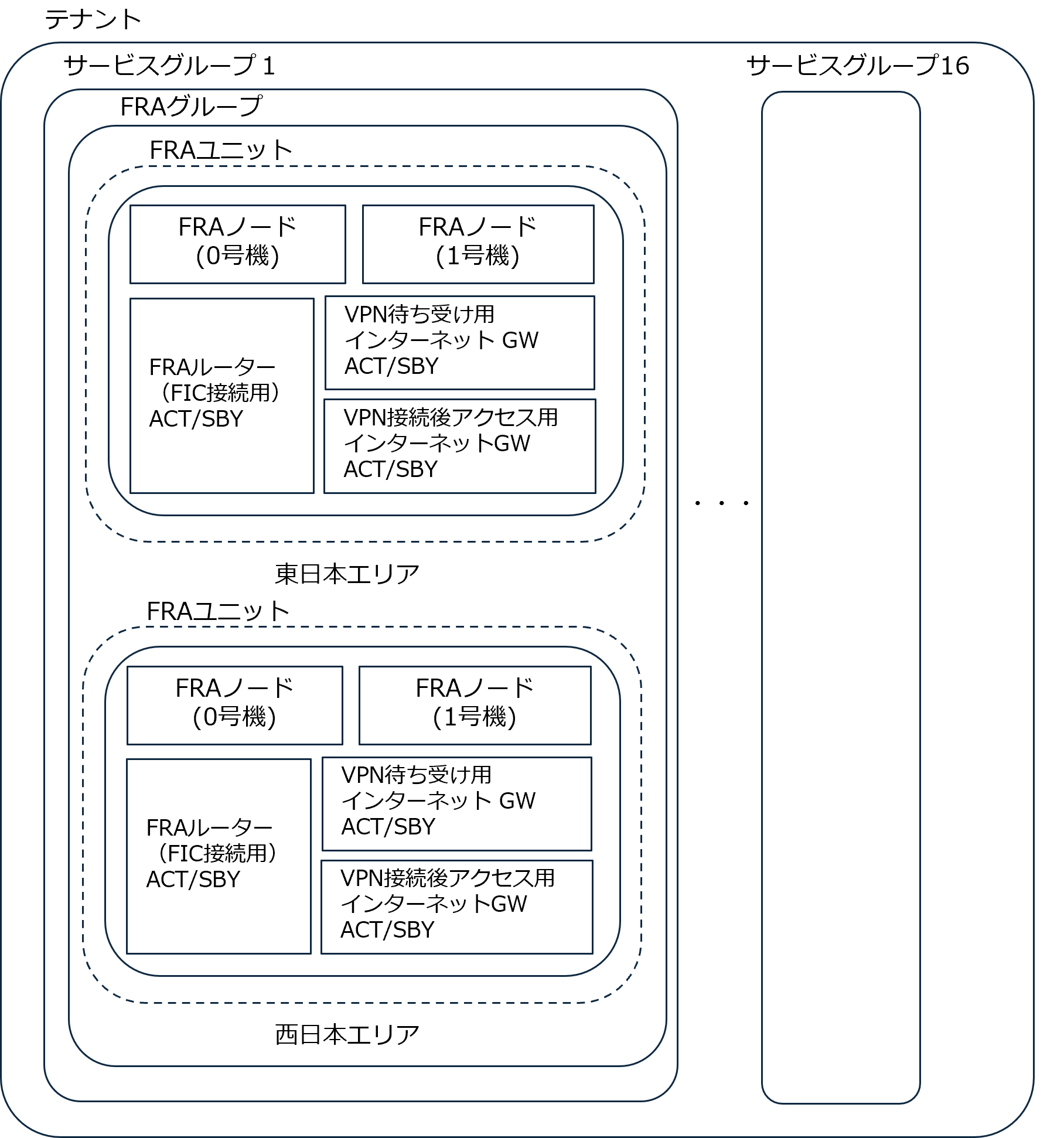 FRAグループとはサービスグループ内でFRAサービスを利用する際の管理単位です。1つのFRAグループにつき東日本と西日本の各エリアに1つのFRAユニットを作成することが出来ます。FRAグループでは最大接続ID数や接続帯域、オプション等の管理を行います。