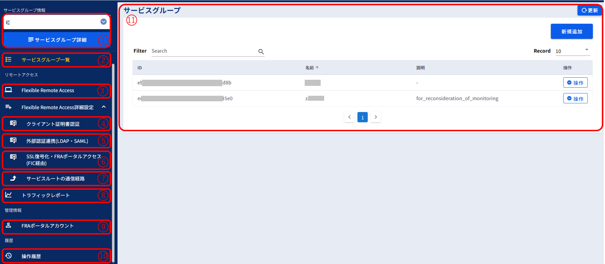 サービスグループは、FRAサービスを利用する際の管理グループです。FRAサービスを初めて利用する場合はまずサービスグループを作成していただきます。1つのテナントには最大16個のサービスグループを作成いただくことが出来ます。