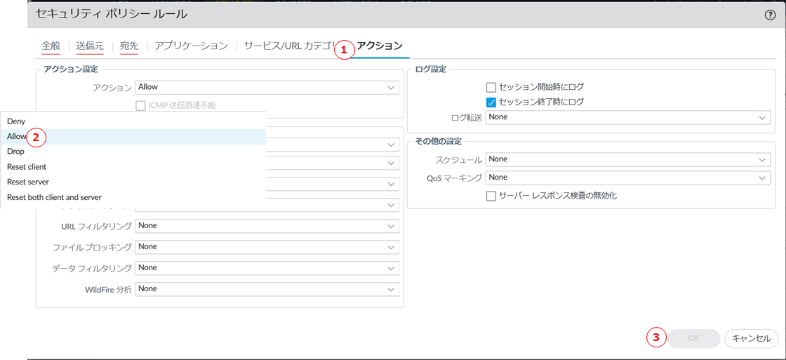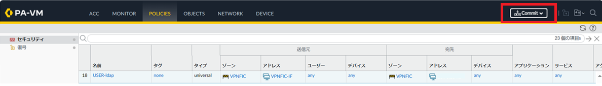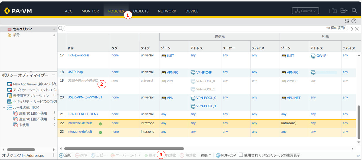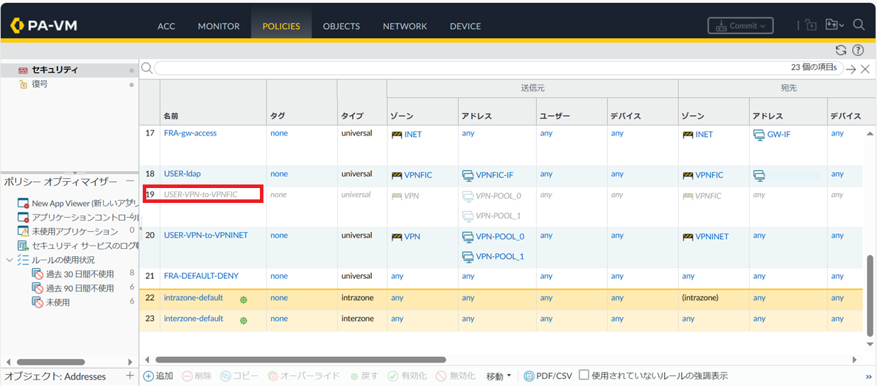 - 初期設定はインターネット向き通信とFIC向き通信のポリシーが無効化の設定になっているため、必要に応じて有効化する必要があります。インターネット向き通信を有効化する場合は、USER-VPN-to-VPNINETを選択してください。FIC向き通信を有効化する場合はUSER-VPN-to-VPNFICを選択してください。
