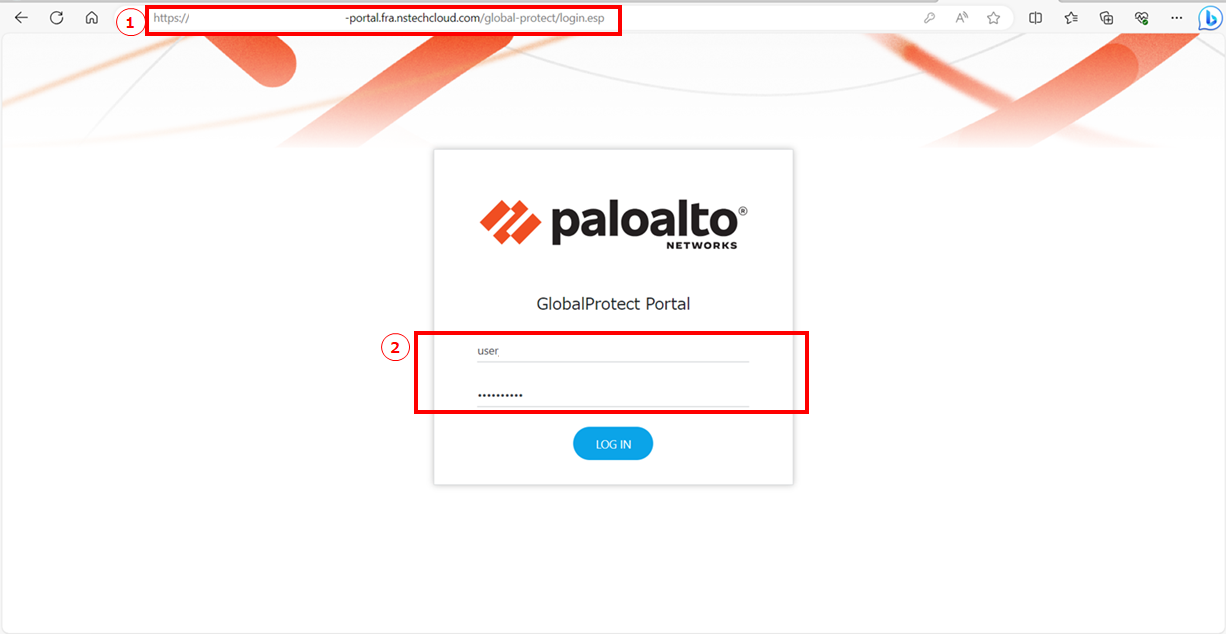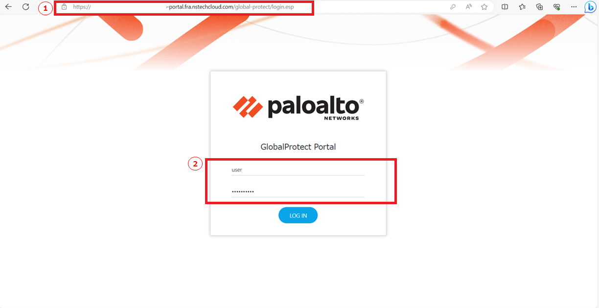 https://example-portal.fra.ntt.com)しアクセスします。② UsernameとPasswordにリモートアクセスユーザーのユーザーIDとパスワードを入力し[LOGIN]ボタンを押下します。なお、SAML認証連携を使用している場合、連携先の認証画面が表示されます。