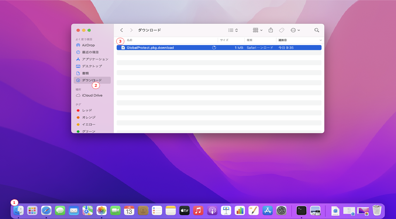 - ① [finder]アイコンをクリックします。② [ダウンロード]をクリックします。③ [GlobalProtect.pkg.download]をダブルクリックします。