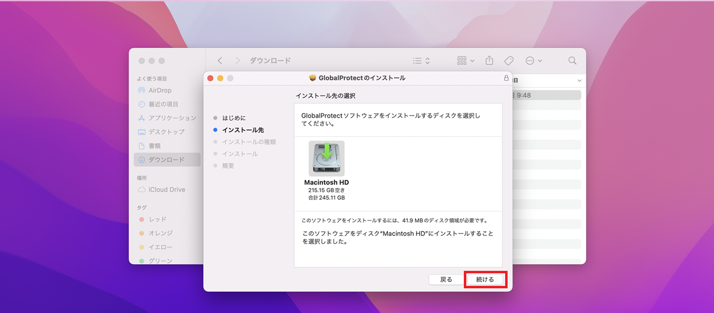インストール先の画面が表示されます。[続ける]ボタンを押下します。