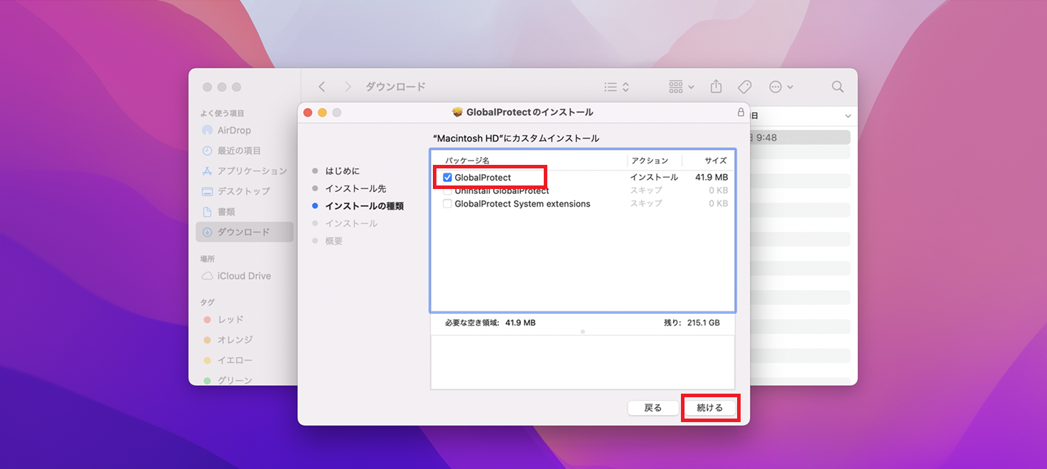 インストールの種類の画面が表示されます。GlobalProtectにチェックが入っている事を確認し[続ける]ボタンを押下します。