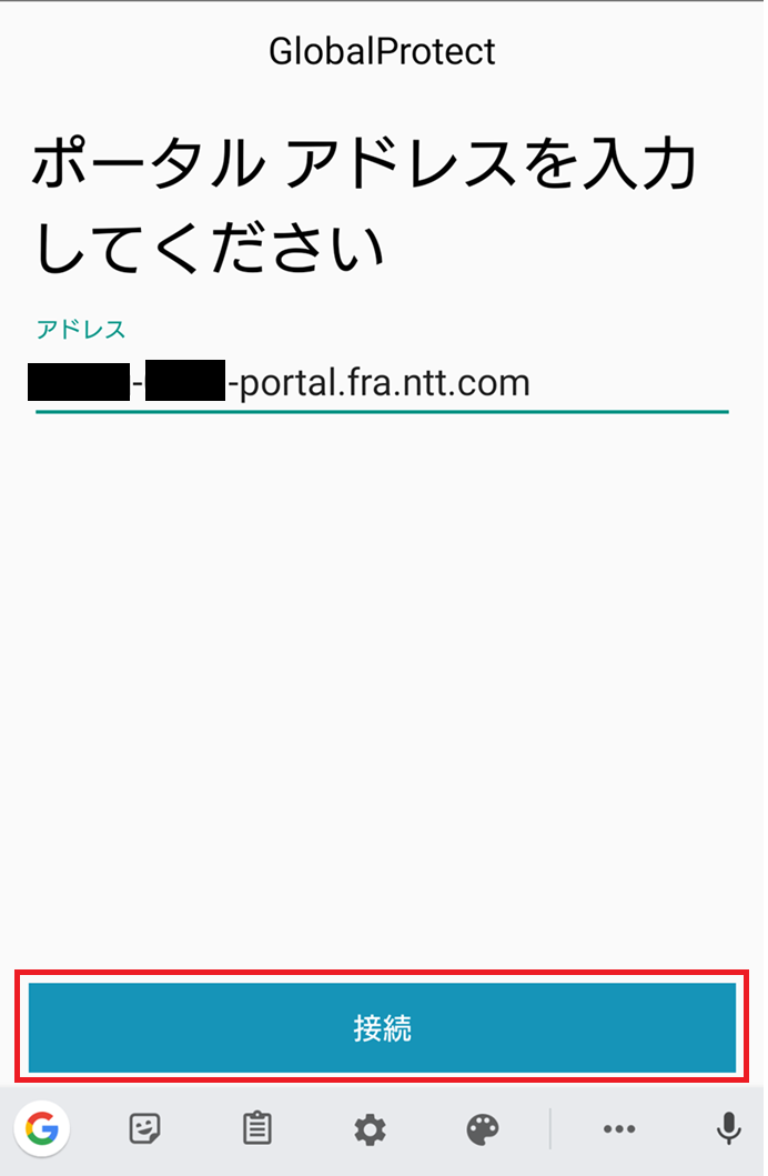 ホーム画面上の[Global Protectアプリ]をクリックします。クリック後に表示された以下の画面で、認証ポータルのアドレス(example-portal.fra.ntt.com)をポータルのアドレスに入力し[接続]ボタンを押下します。