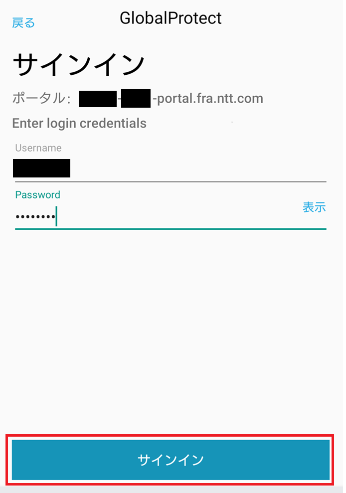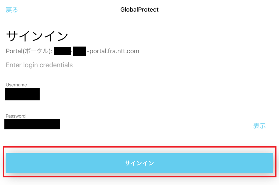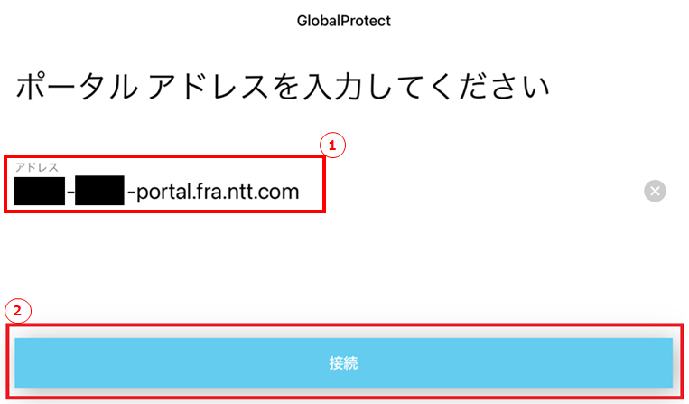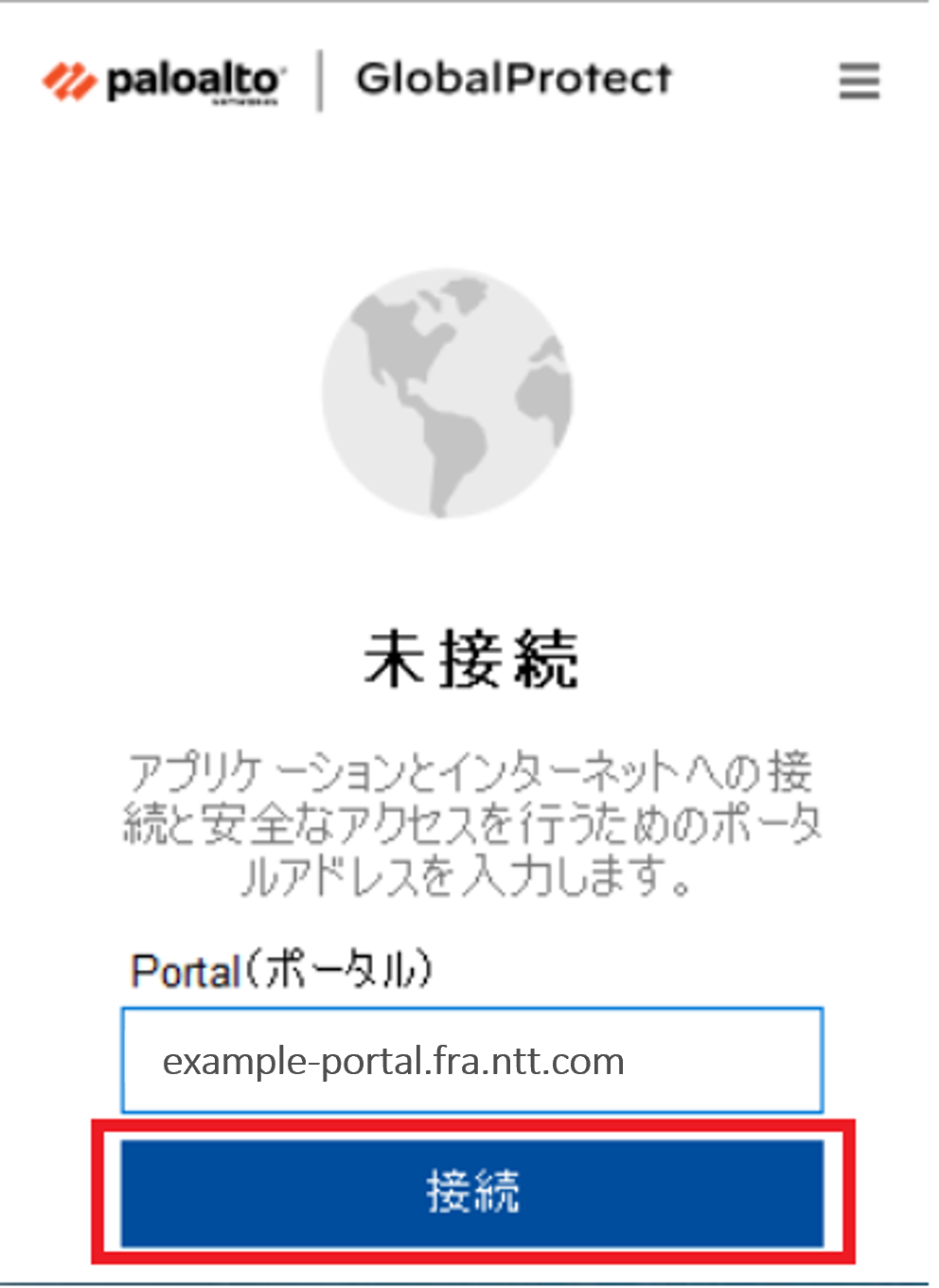 ホーム画面上の[Global Protectアプリ]をクリックします。認証ポータルのアドレス(example-portal.fra.ntt.com)がポータルのアドレスに入力されている事を確認し[接続]ボタンを押下します。