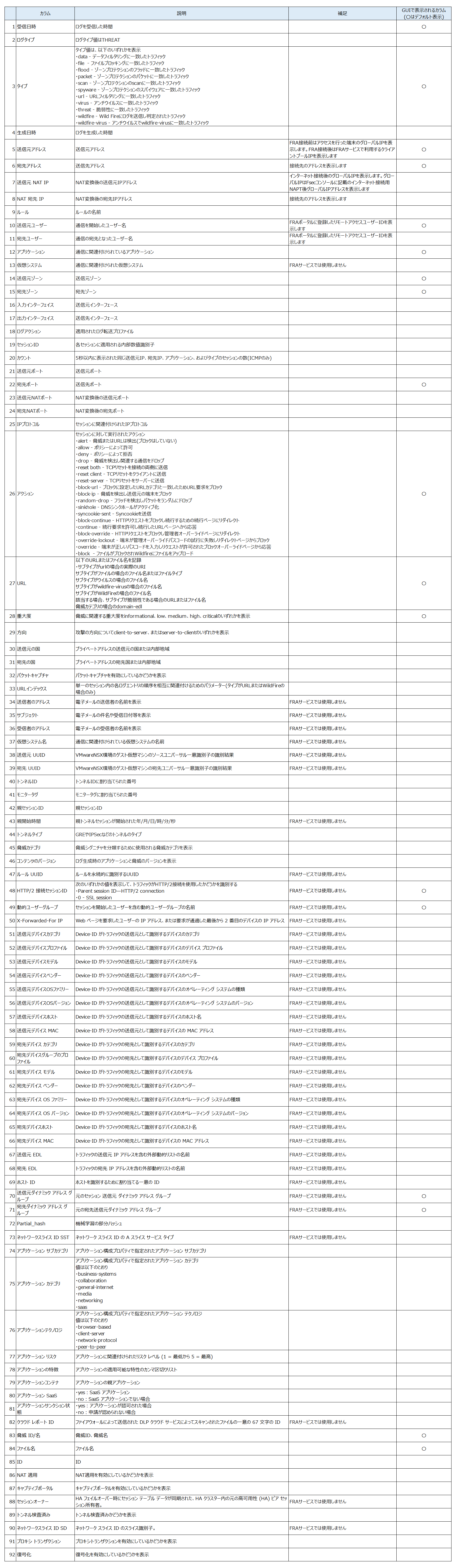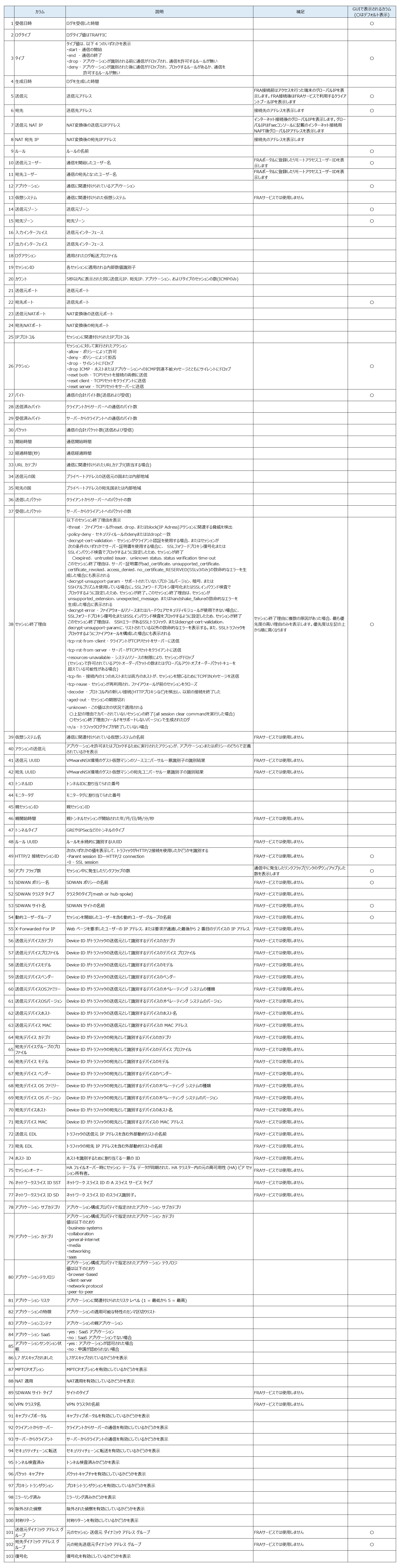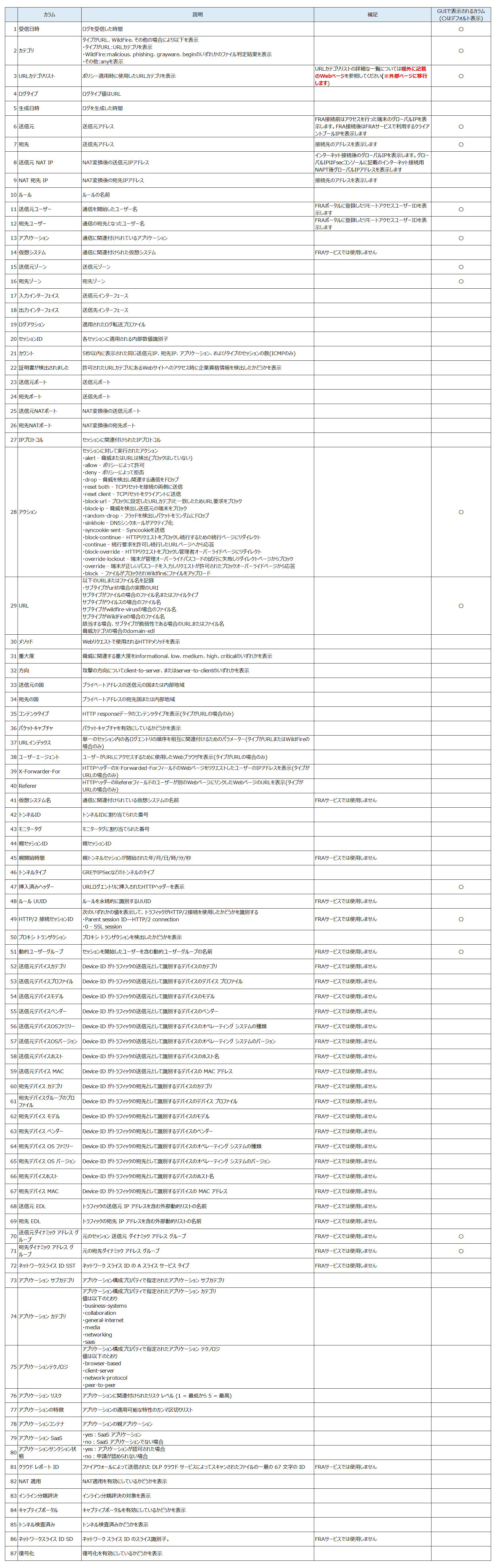各ログ種別の確認可能なカラム一覧は以下です。