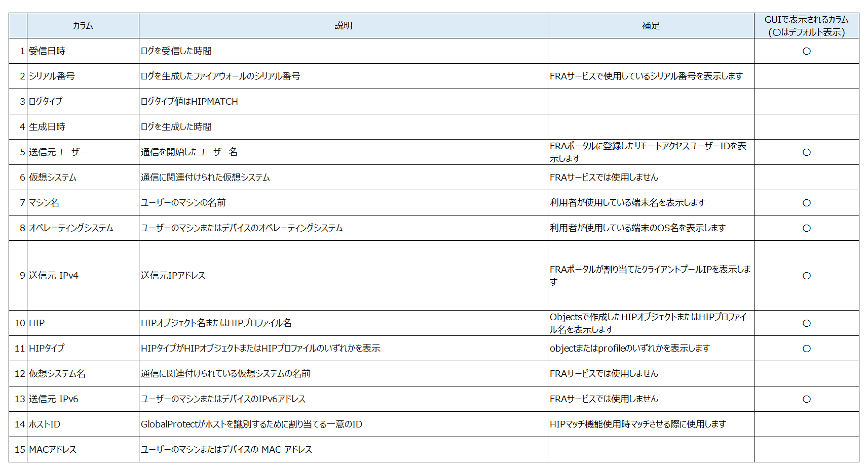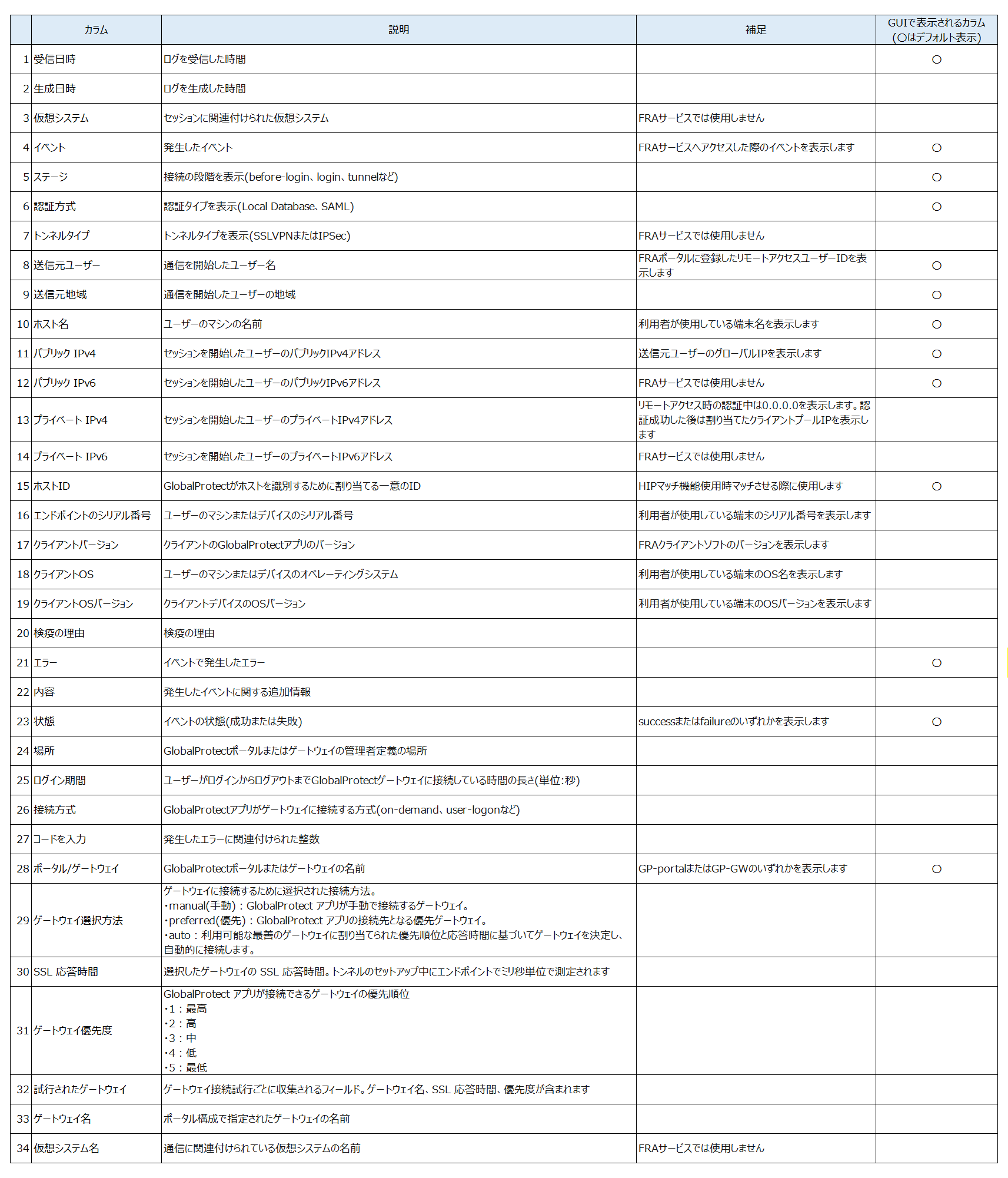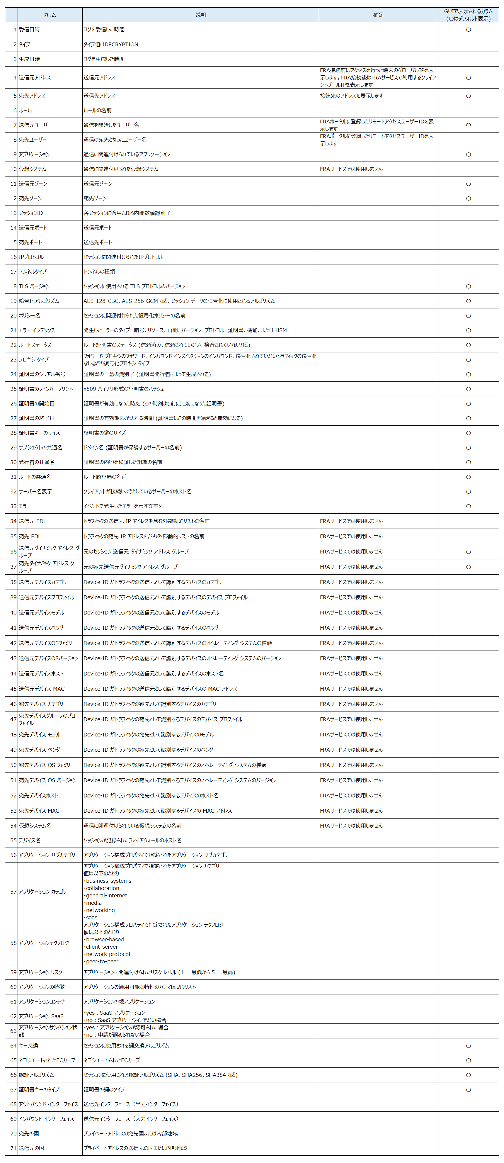 各ログ種別の確認可能なカラム一覧は以下です。
