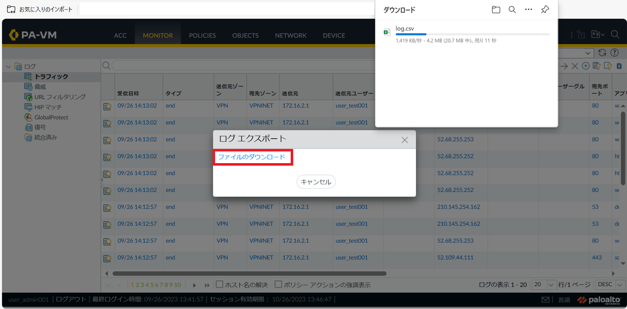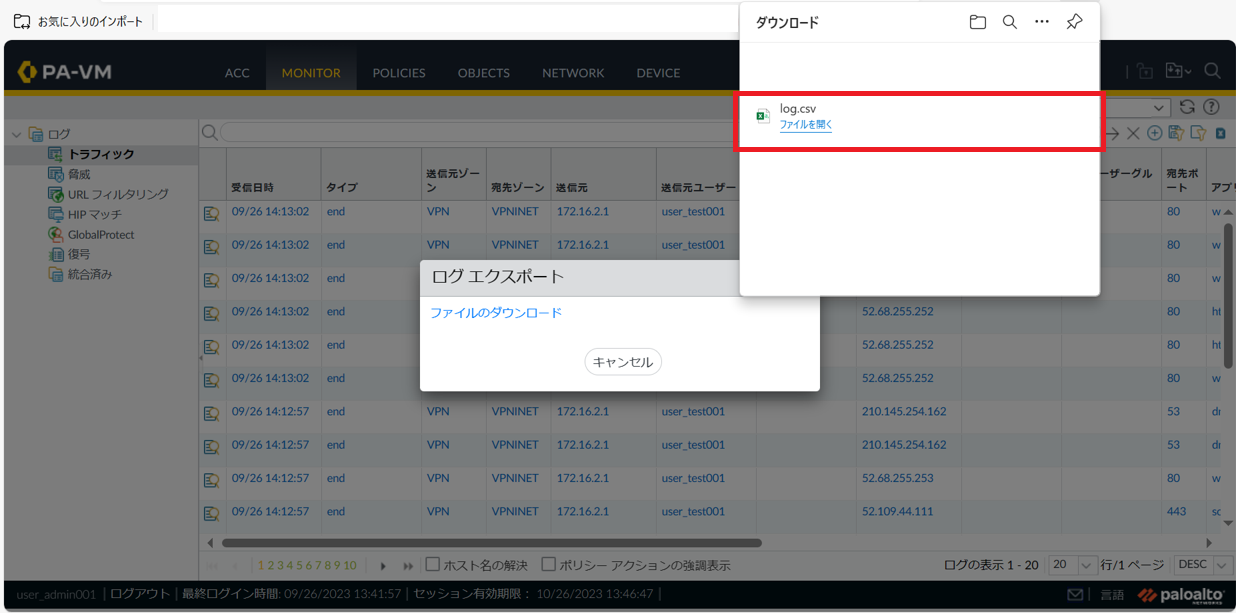 ファイルのダウンロードが完了すると下記の画面が表示されます。ログをCSVファイルで参照頂く事ができます。