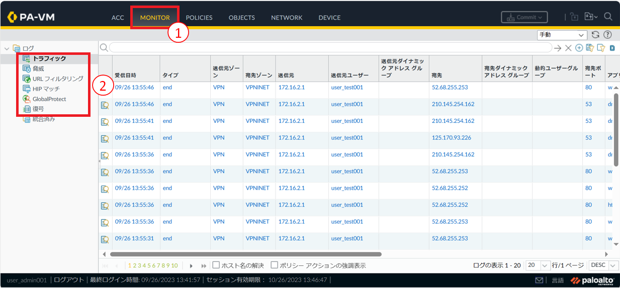 - ①[Monitor]をクリックします。②CSV出力したいログをクリックします。