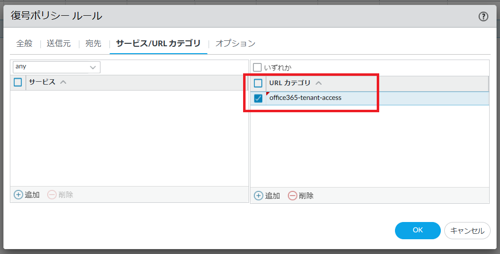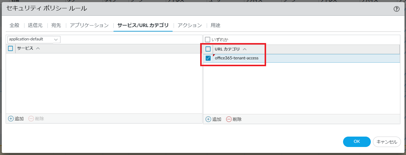 [サービス/URLカテゴリ]のURLカテゴリにて[追加]をクリックし 「4.5.4.1テナントアクセス制御用のURLカテゴリを作成する」 で作成したURLカテゴリを指定します。