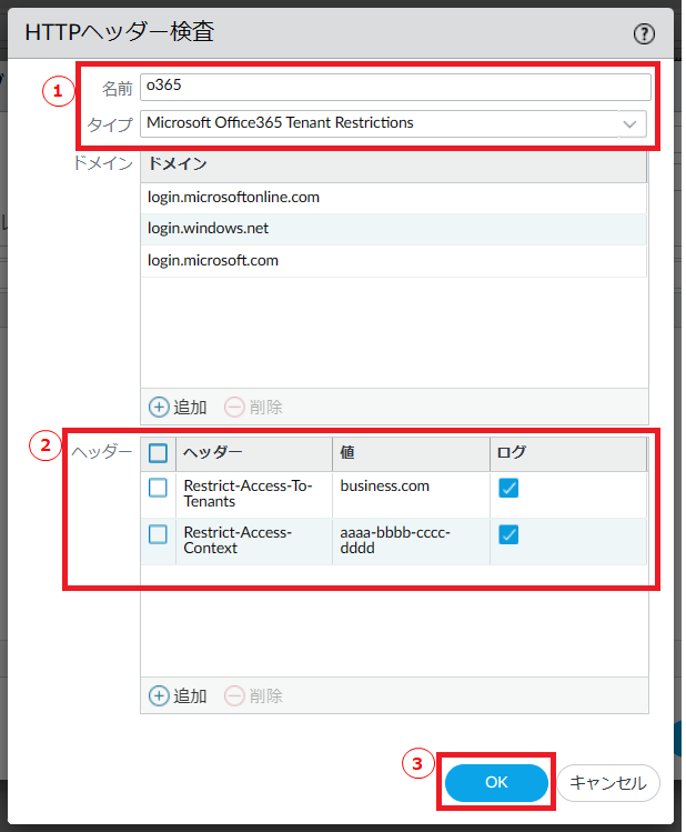 タイプの設定でMicrosoft Office365 Tenant Restrictionsを指定するとでRestrict-Access-To-Tenants,Restrict-Access-Contextのヘッダーが表示されます。ヘッダーに以下を入力します。ログにチェックを入れてください。