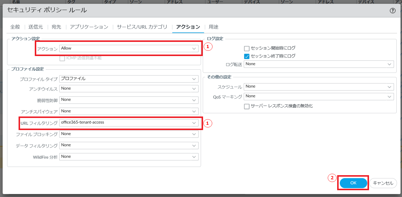 「4.5.4.2. テナントアクセス制御用のセキュリティプロファイル(URLフィルタリング)を作成する」 で作成したURLフィルタリングを指定します。 |
