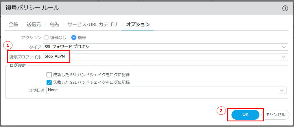 - ①[オプション]で 「4.5.4.4. テナントアクセス制御用のSSL復号化プロファイルを作成する」 にて作成したSSL復号化プロファイルを指定します。②入力が完了したら[OK]ボタンを押下します。