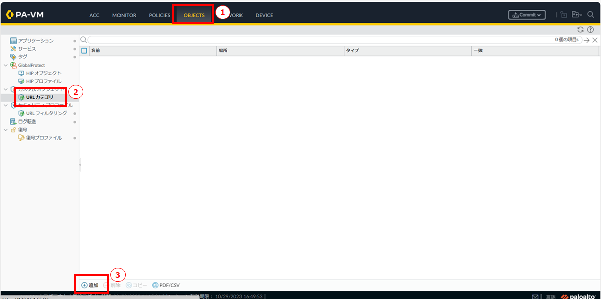 - ➀[Objects]をクリックします。➁[URLカテゴリ]をクリックします。➂[追加]をクリックします。