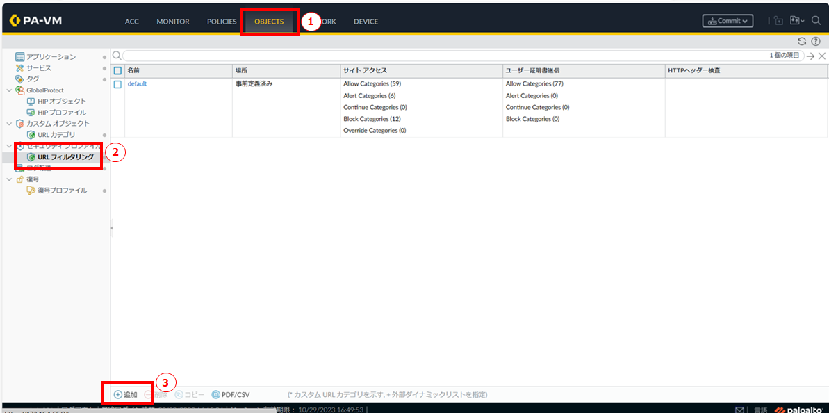 - ➀[Objects]をクリックします。➁[URLフィルタリング]をクリックします。➂[追加]をクリックします。
