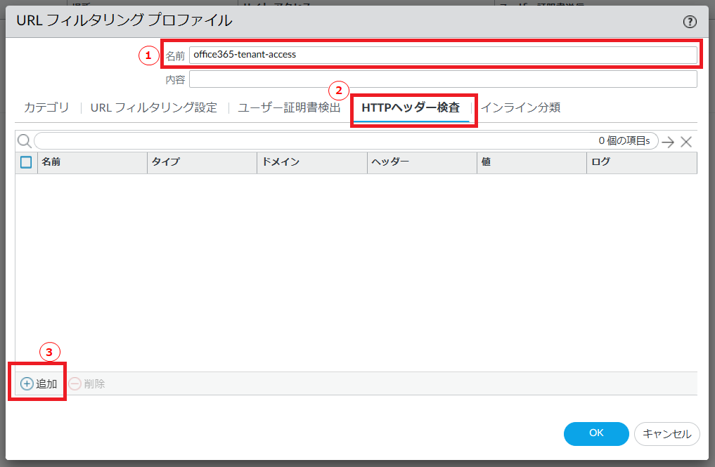 - ➀名前を入力します。➁[HTTPヘッダー検査]をクリックします。➂[追加]をクリックします。