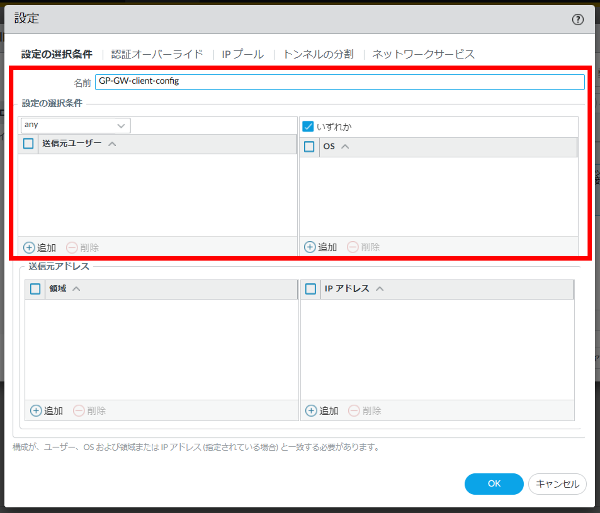 8.1.5.15. Network > GlobalProtect>ゲートウェイ> GP-GW>エージェント>クライアントの設定>追加(既存の設定を変更したい場合はGP-GW-client-configをクリック) >設定の選択条件¶