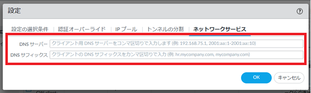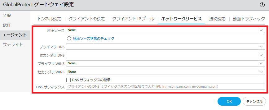 8.1.5.19. Network > GlobalProtect>ゲートウェイ> GP-GW>エージェント>クライアントの設定>追加(既存の設定を変更したい場合はGP-GW-client-configをクリック) >ネットワークサービス¶
