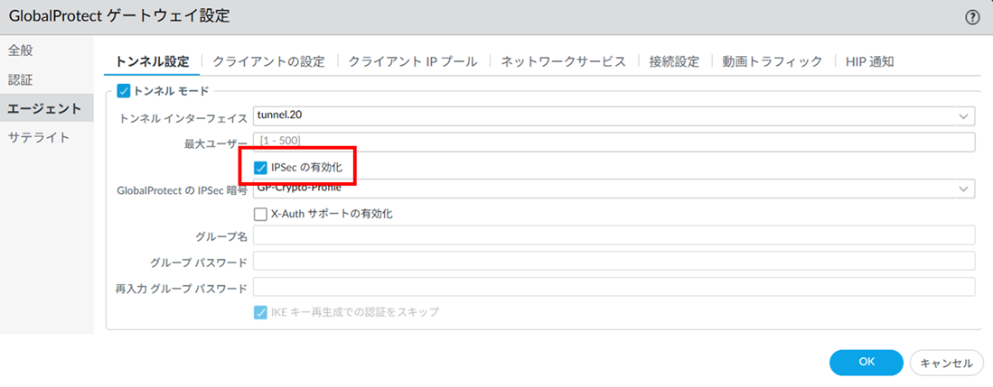 8.1.5.13. Network > GlobalProtect>ゲートウェイ> GP-GW>エージェント>トンネル設定¶