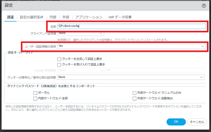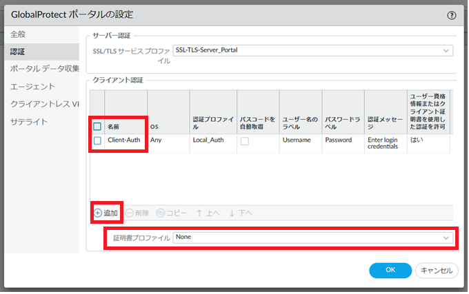 8.1.5.5. Network > GlobalProtect>ポータル> GP-portal>エージェント> 追加(既存の設定を変更したい場合はGP-client-configをクリック) >認証¶