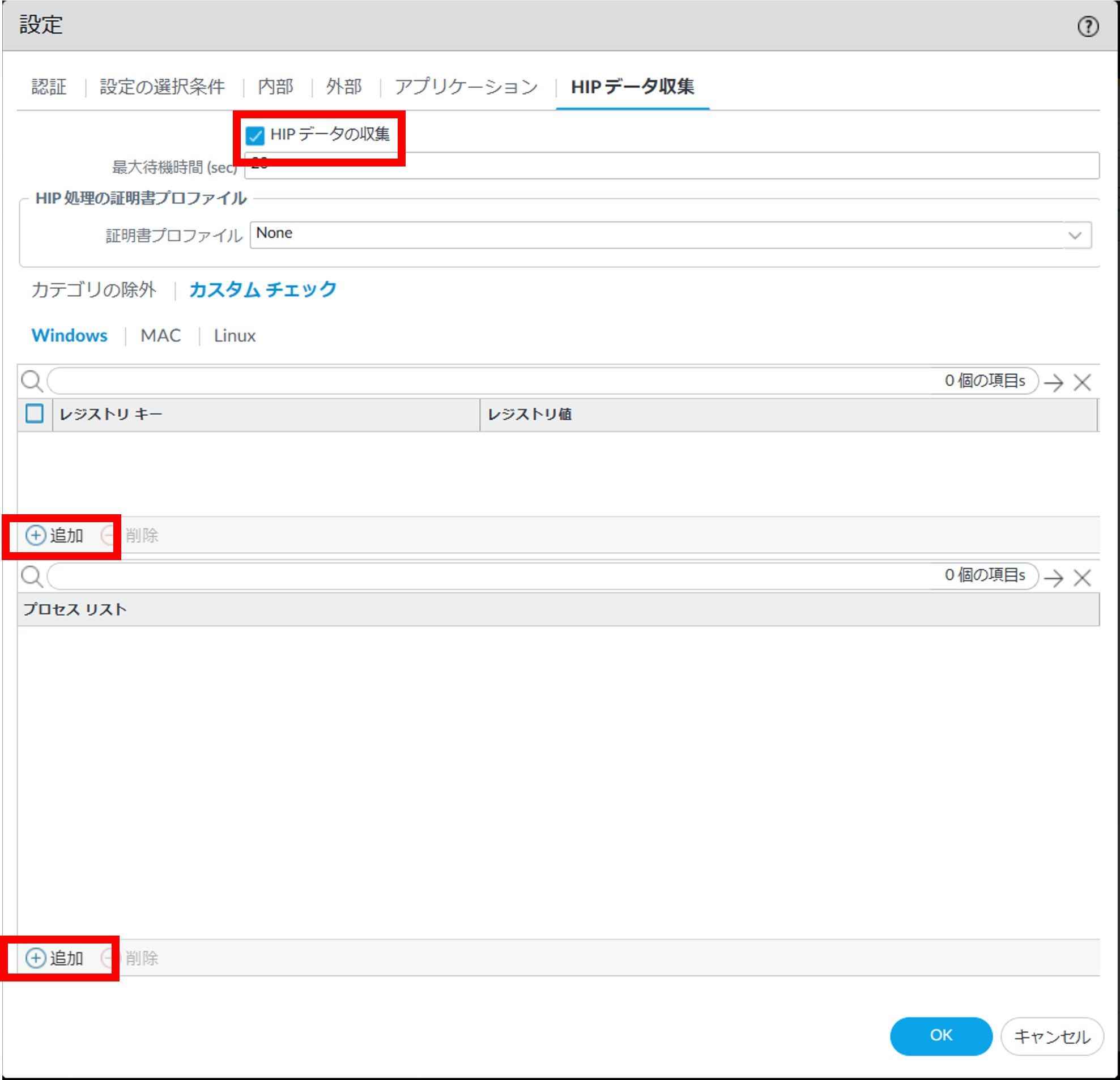 8.1.5.9. Network > GlobalProtect>ポータル> GP-portal>エージェント>追加(既存の設定を変更したい場合はGP-client-configをクリック) >HIPデータ収集¶