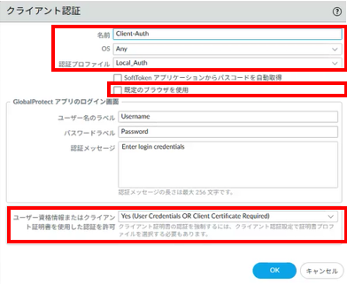 8.1.5.3. Network > GlobalProtect>ポータル> GP-portal>認証> 追加(既存の設定を変更したい場合は追加済みのクライアント認証設定をクリック)¶