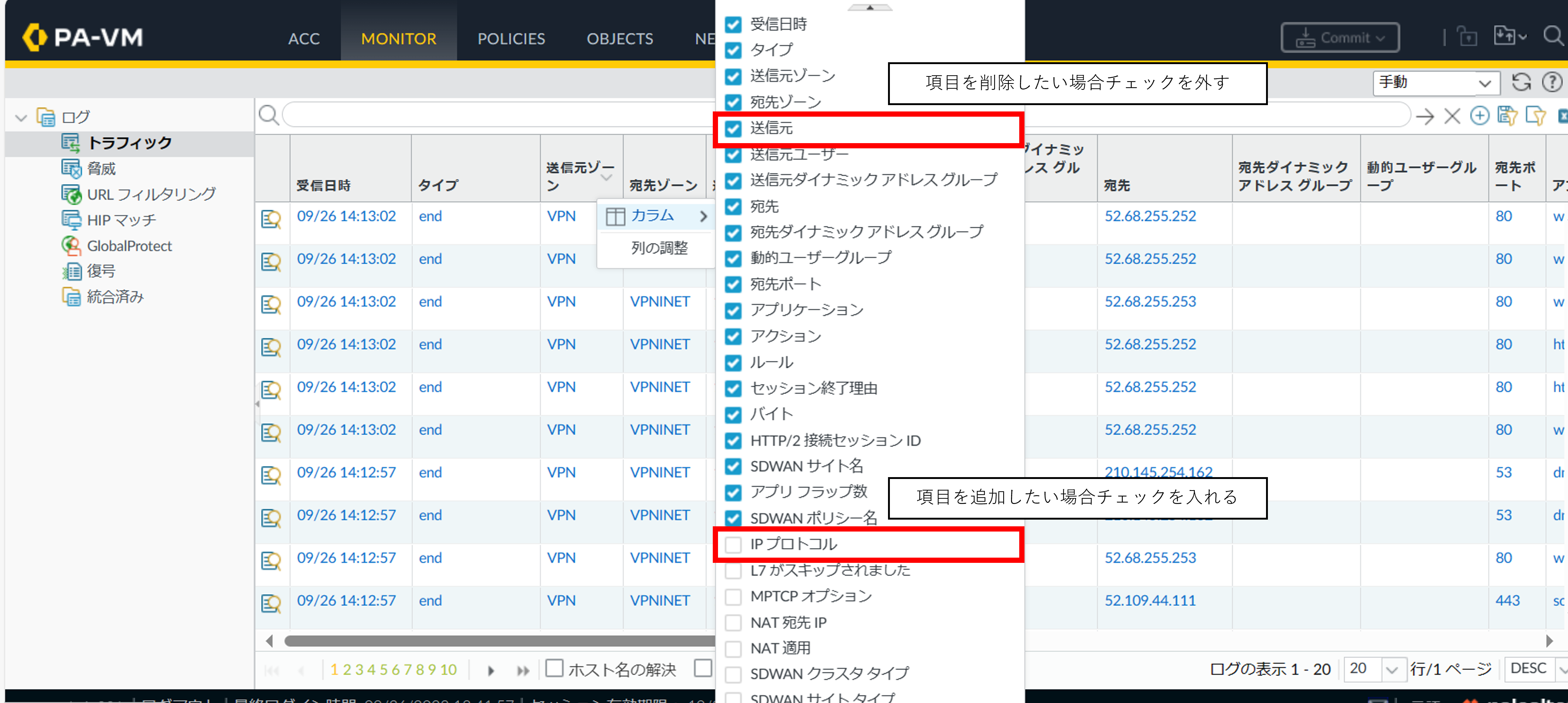 [カラム]をクリックすると追加、削除可能な項目が表示されます。追加したい場合はチェックボックスにチェックを入れ、削除したい場合はチェックを外します。