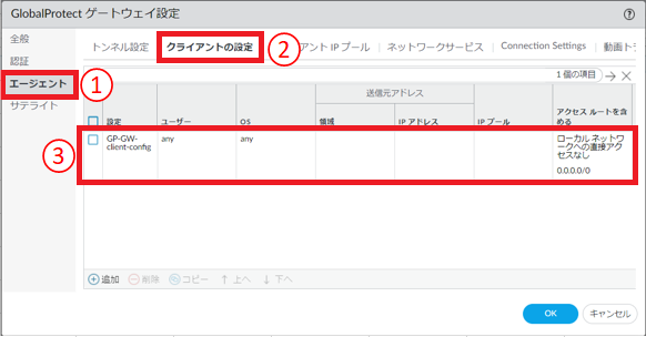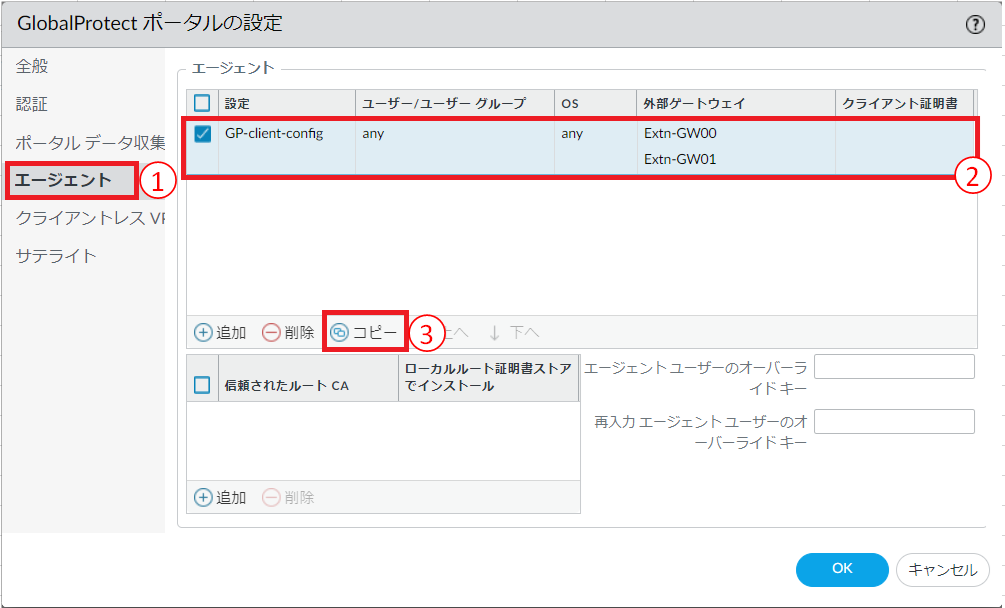 - ①[エージェント]をクリックします。②[クライアントの設定]をクリックします。③[GP-GW-client-config]を選択します。④[コピー]をクリックします。