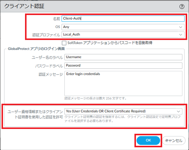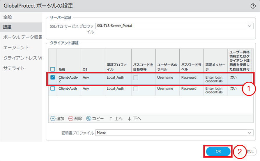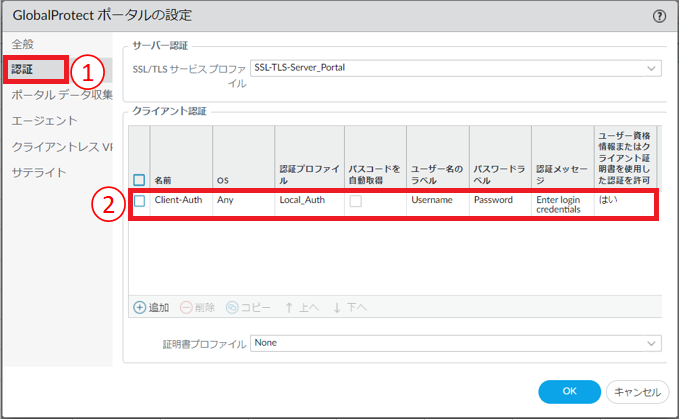 - クライアント認証の変更をしたい場合は 8.6.5. GlobalProtectポータル 認証の変更をする を参照してください。