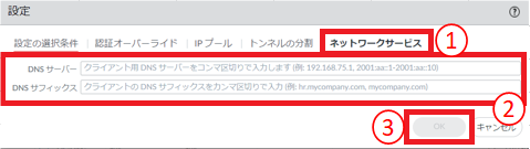 クライアント用DNSサーバーをカンマ区切りで入力します。 |