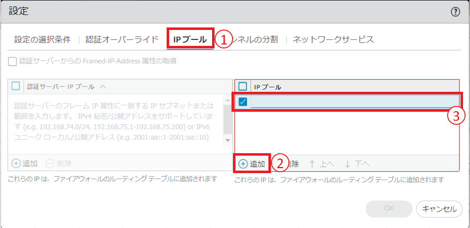 - FRA接続時の端末に払い出すIPを指定する場合は以下設定を行います。①[IPプール]をクリックします。②[追加]をクリックします。③払い出す対象のIPアドレスを設定します。