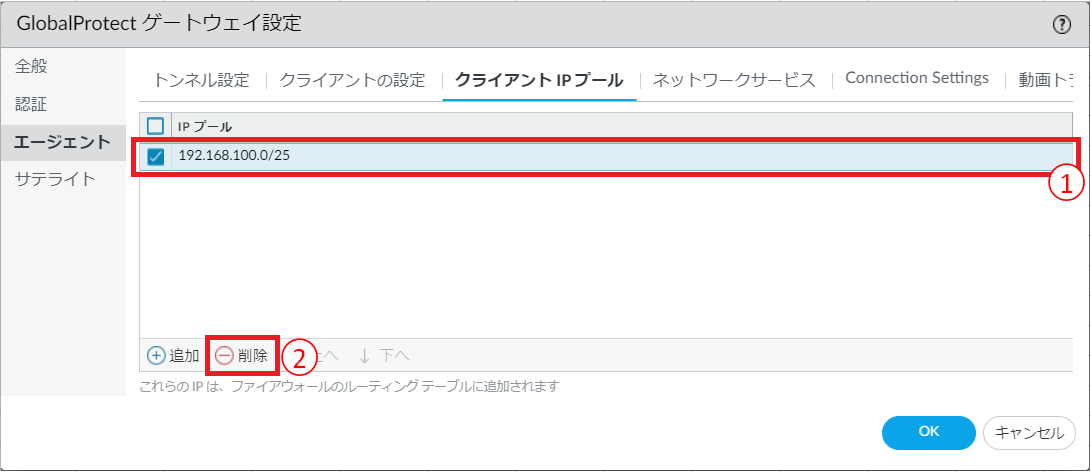 - この設定でFRA接続時の端末に払い出すIPを指定する場合、以下のクライアントIPプールタブの設定を削除してから設定する必要があります。①設定されているIPプールを選択します。②[削除]をクリックします。