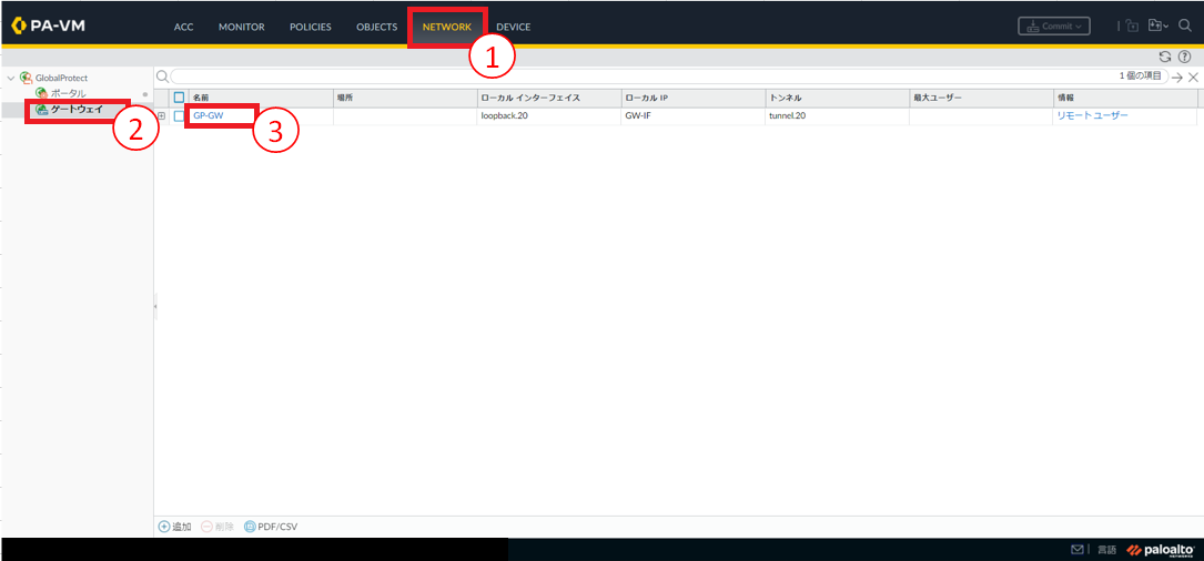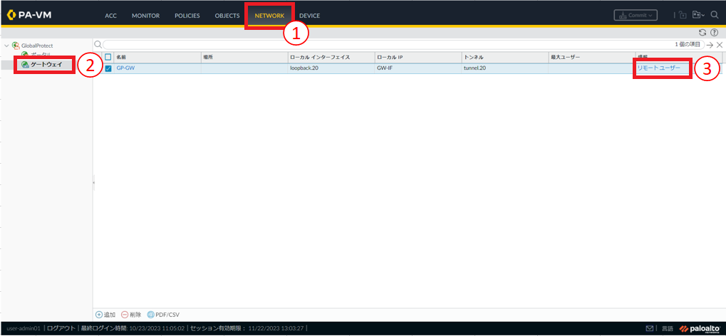- ①[Network]をクリックします。②[ゲートウェイ]をクリックします。③画面右端の[リモートユーザー]をクリックします。