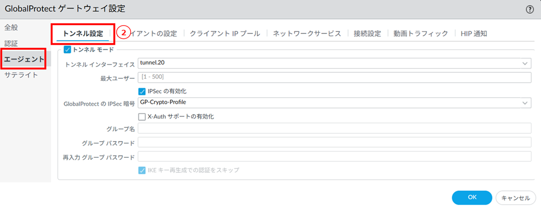 - ①[エージェント]をクリックします。②[トンネル設定]をクリックします。