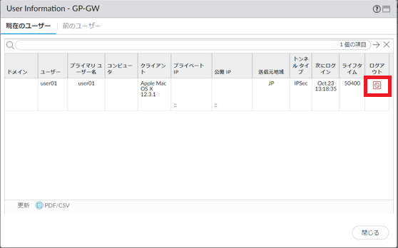 FRA接続を切断したいユーザーの[ログアウトのアイコン]をクリックします。コミットは不要でユーザーの接続が切断されます。