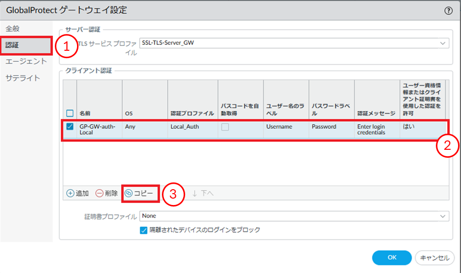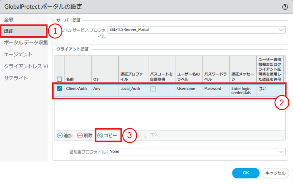 - ①[認証]をクリックします。②[Client-Auth]を選択します。③[コピー]をクリックします。