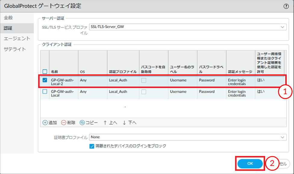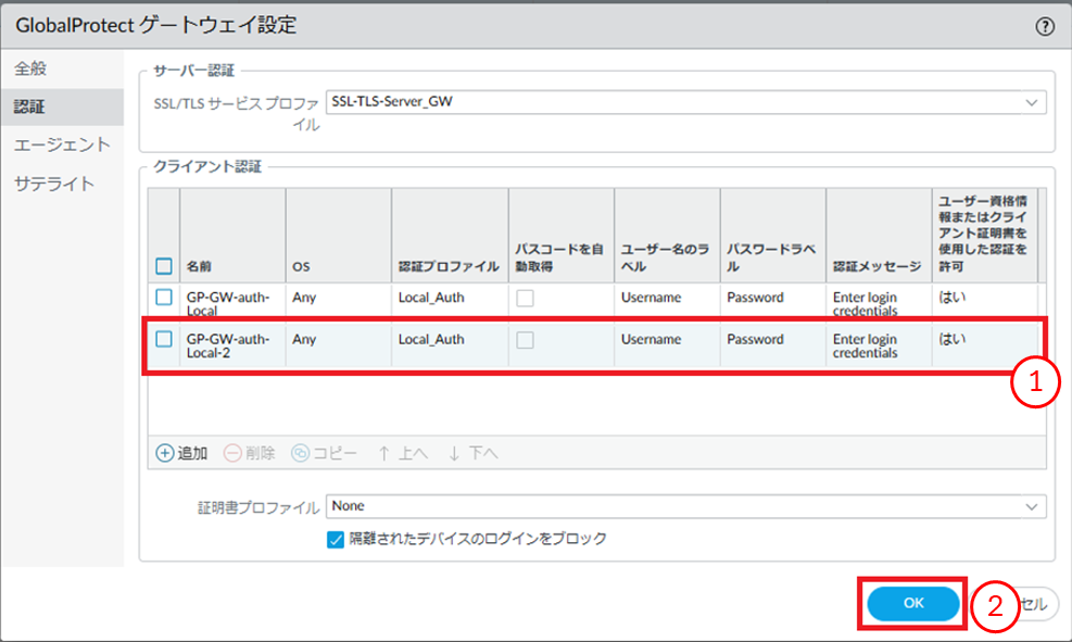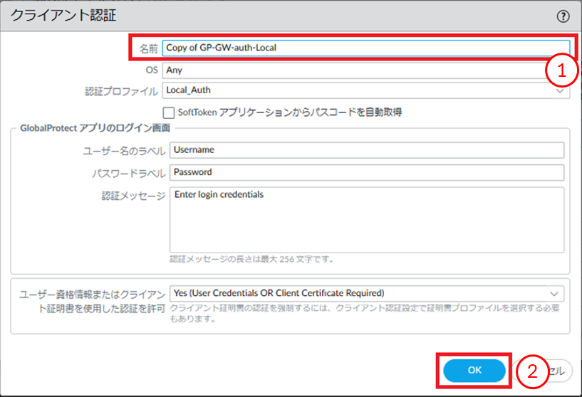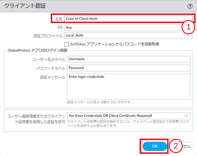 - ①クライアント認証が追加されたことを確認します。②[OK]ボタンを押下します。