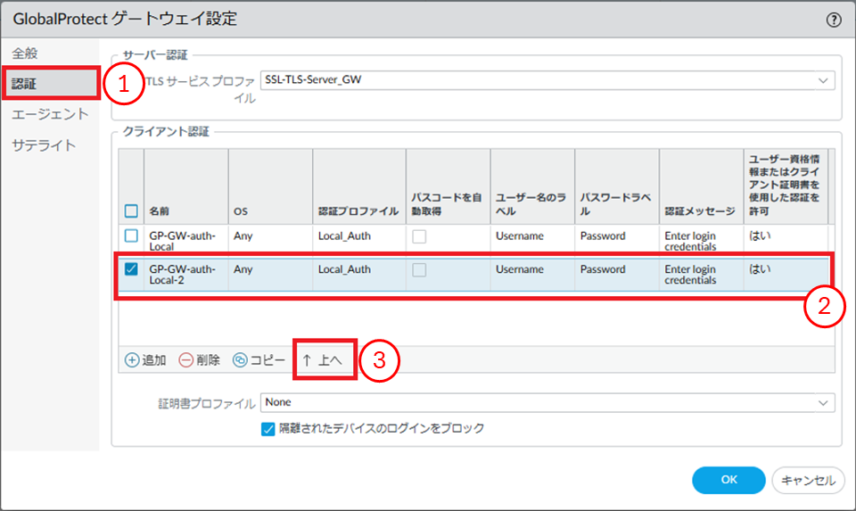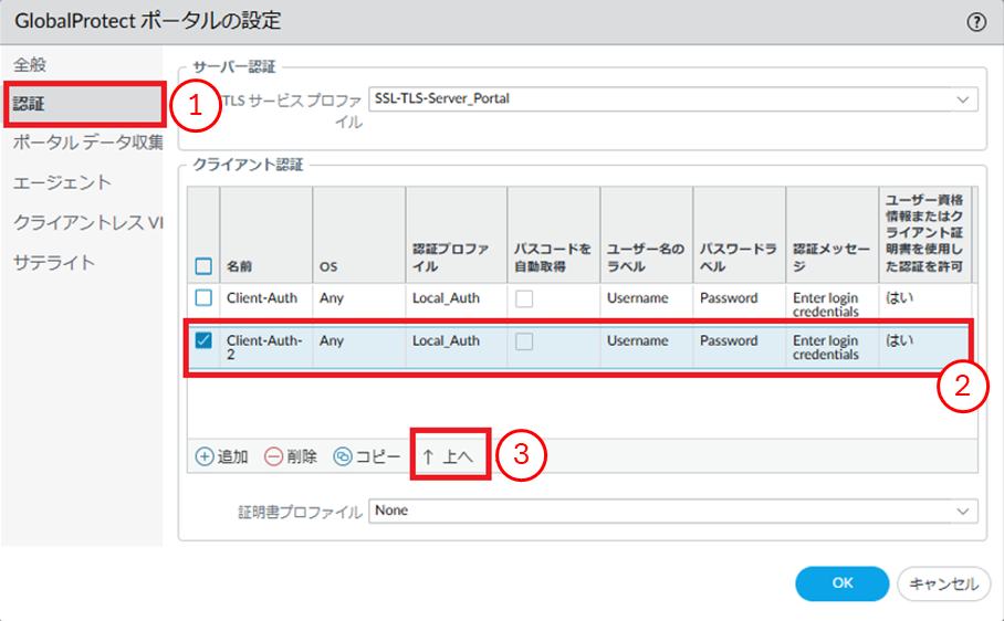 - ①[認証]をクリックします。②対象のクライアント認証を選択します。③[上へ]をクリックします。
