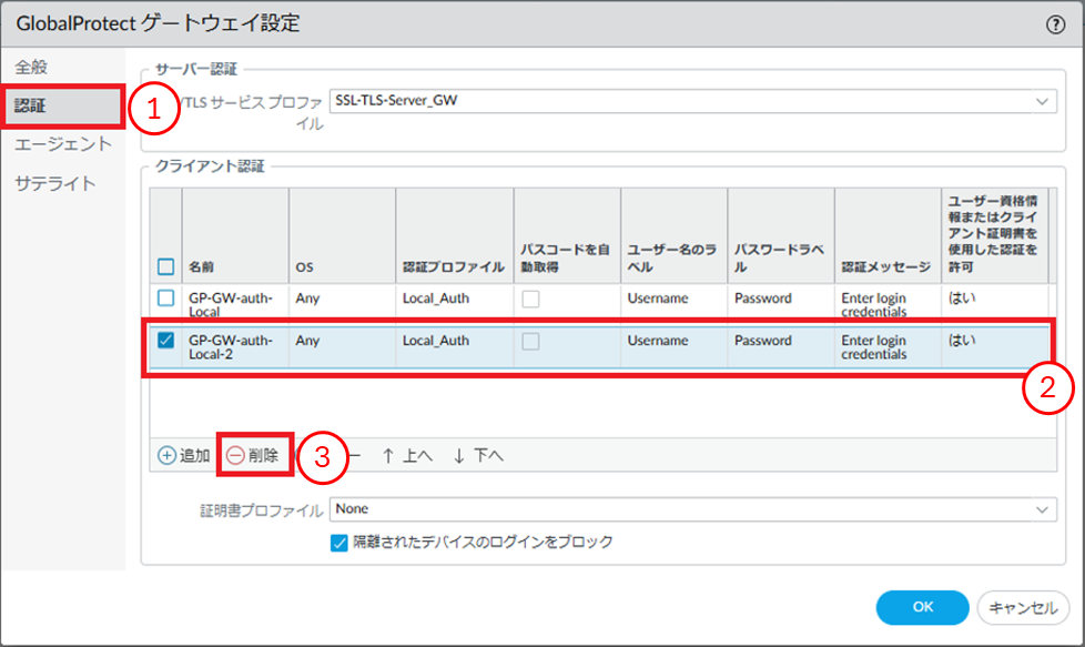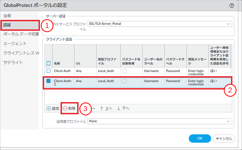 - ①[認証]をクリックします。②削除対象のクライアント認証にチェックを入れます。③[削除]をクリックします。
