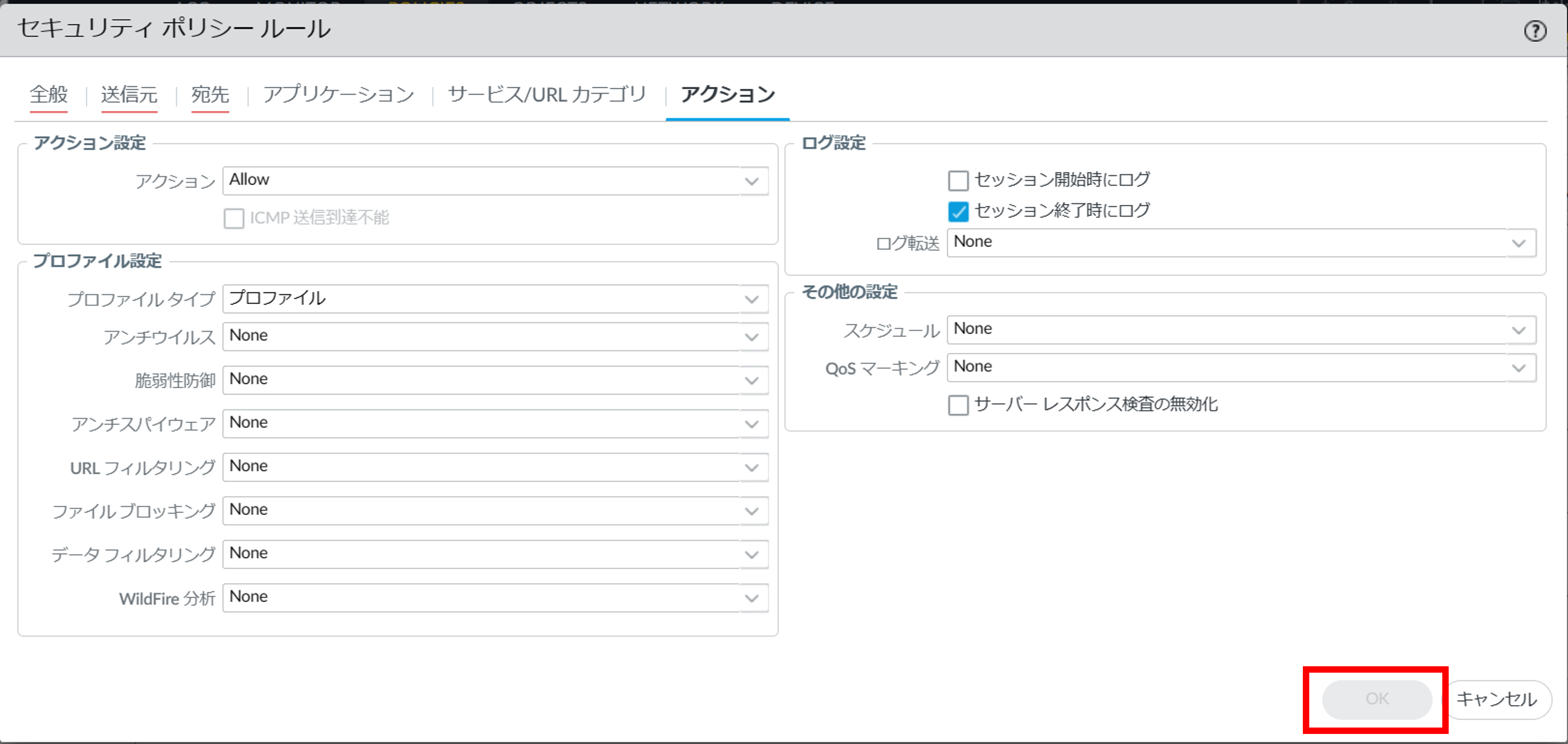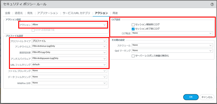 通信開始時のログを記録したい場合はセッション開始時にログにチェックをします。通信終了時のログを記録したい場合はセッション終了時にログにチェックをします。通信の開始/終了を記録したい場合は両方にチェックをします。Syslogサーバーにログを転送する場合はログ転送からログ転送プロファイルを選択します。 |