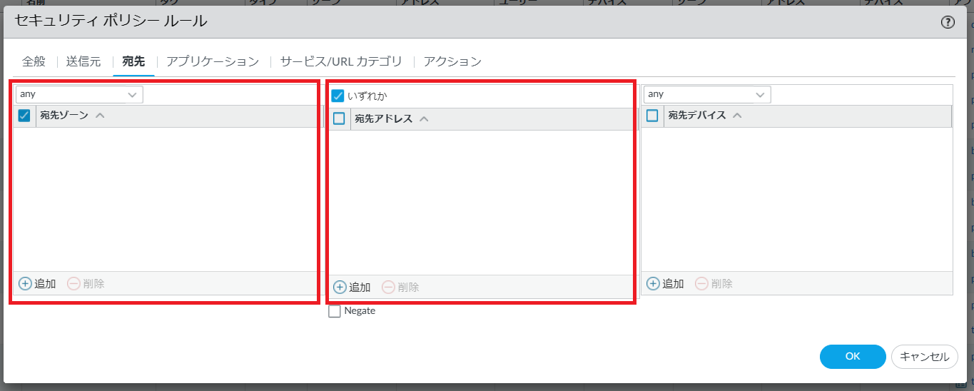 通信の宛先ゾーンを指定します。すべてのゾーンを対象にする場合はanyを選択します。特定のゾーンを宛先に指定したい場合は[追加]をクリックし対象のゾーンを選択します。 |