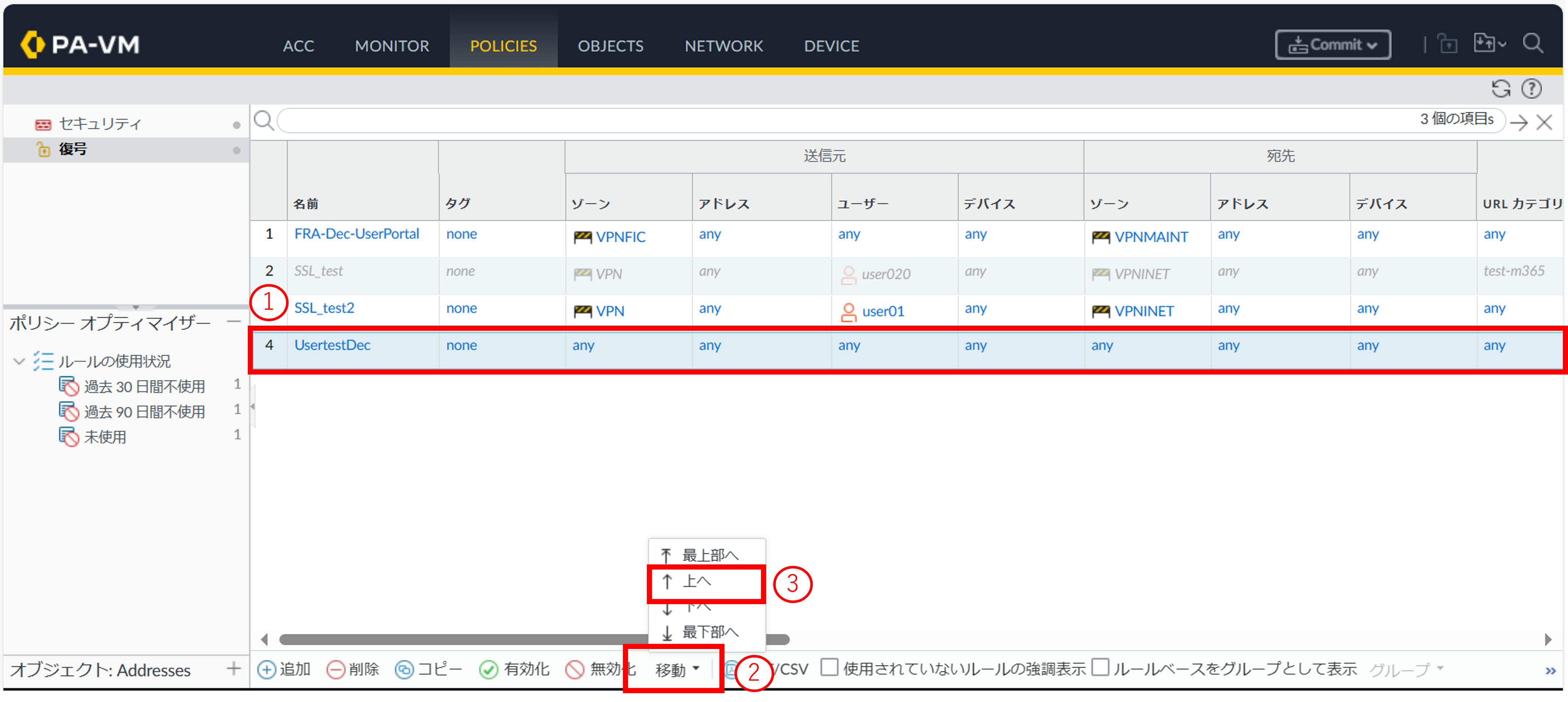 - ➀追加したポリシーを選択します。➁画面下部の[移動]をクリックします。➂[上へ]をクリックしFRA-Dec-UserPortalより下の任意の位置に移動します。